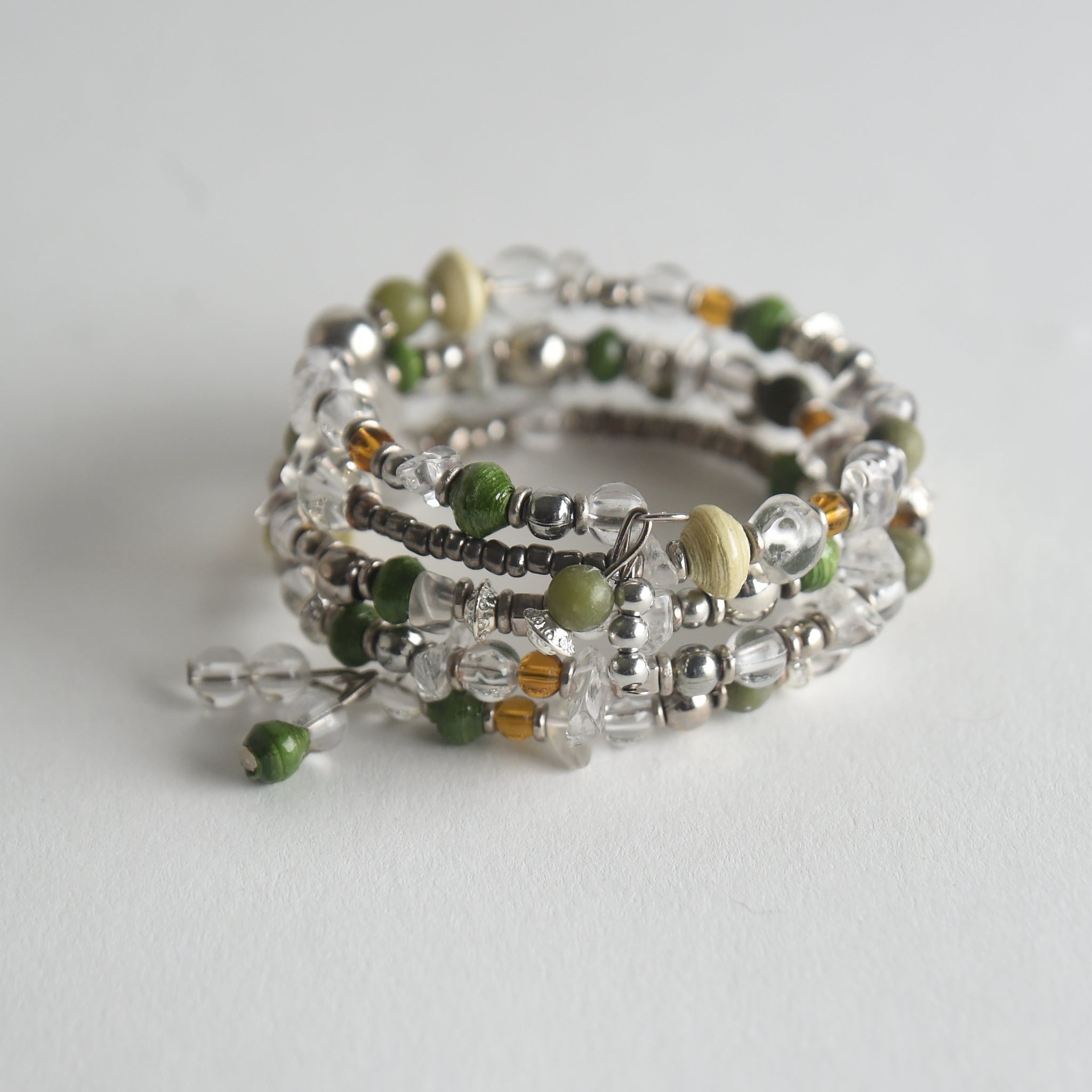 A combination of mixed media, including recycled paper, clay, bone and glass beads, is strung on memory wire for an easy fit. The diameter measures 2.5 inches.