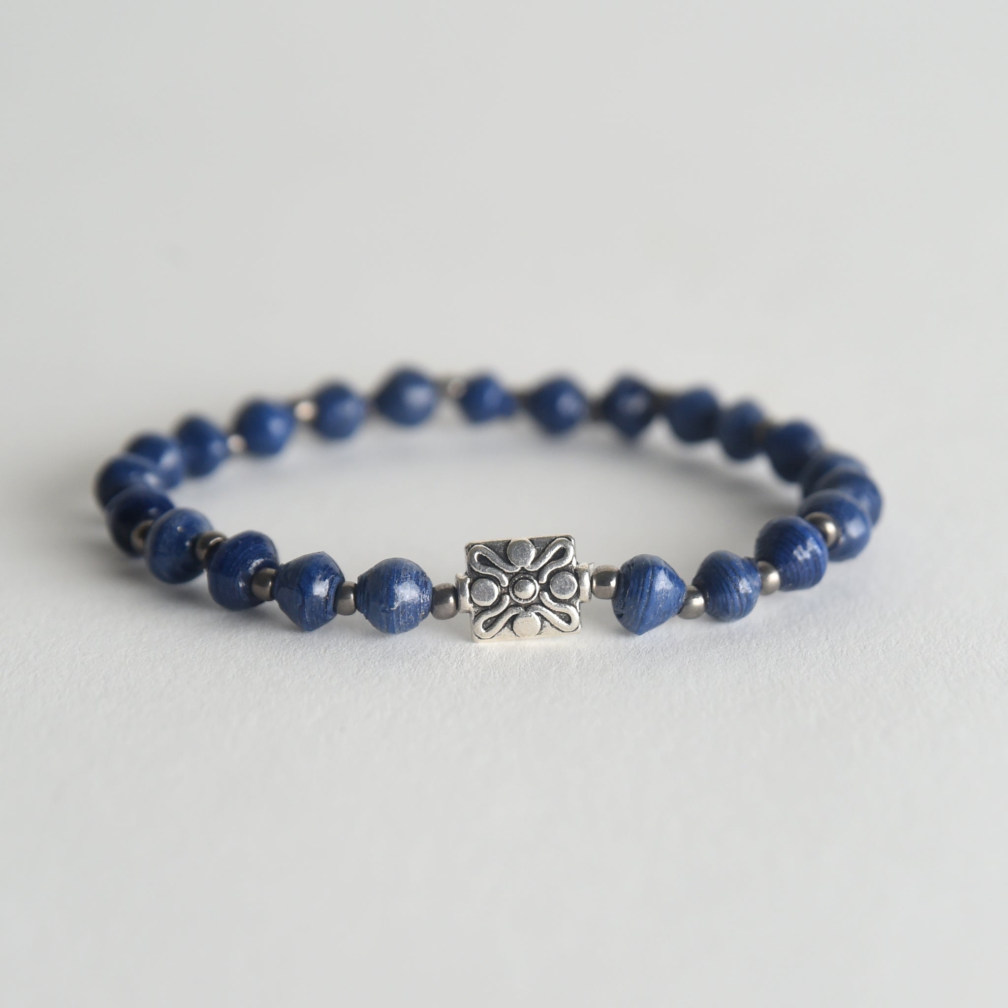 Brightly colored and delicately rolled paper beads, each measuring approximately .25 inches, are strung on clear elastic with a silver accent bead. Stretches to fit most 7 inch or smaller women's wrists.