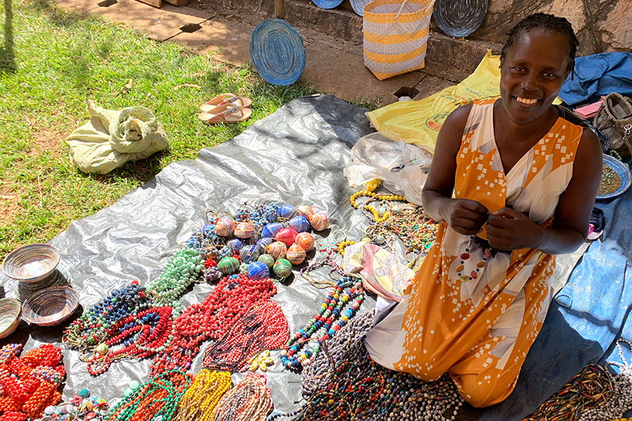 When the paper bead market exploded, Judith eagerly and adeptly mastered the art. She continues to support herself by making and selling jewelry at the Friday craft market. Unlike some women who hire others to roll or string the beads, Judith prefers to do all of the work herself so she can earn more money.